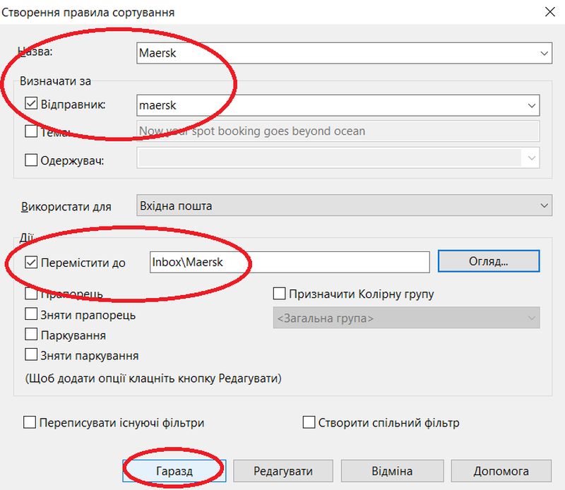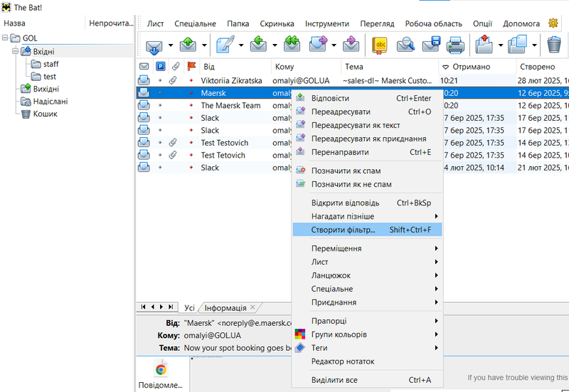Уявіть, що ви отримуєте листи від різних адрес, але всі вони пов’язані з однією компанією, наприклад, Maersk. Замість того, щоб вводити кожну адресу окремо, ви можете просто ввести ключове слово ‘maersk’ у поле ‘Відправник’. Чому це працює? Тому що The Bat! шукає збіг цього слова в будь-якій частині адреси відправника. Таким чином, листи від , та будуть успішно відфільтровані.