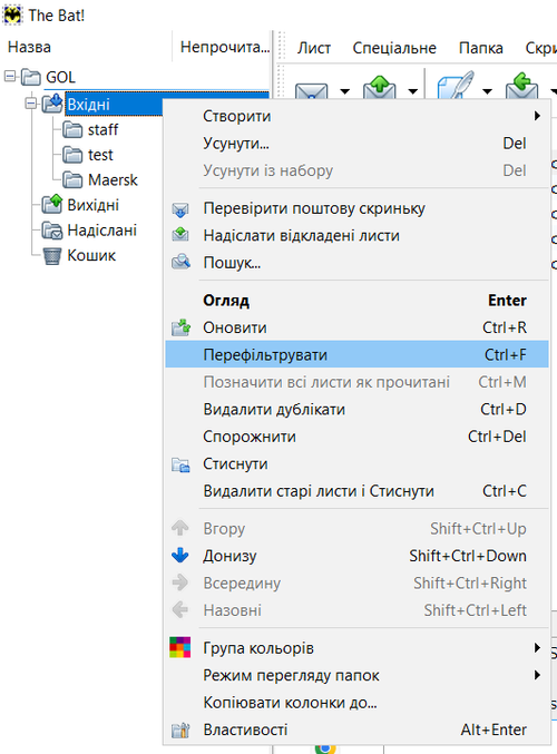 - The Bat! застосує фільтр до всіх листів у вибраній папці, і відповідні листи будуть переміщені в створену вами нову папку.